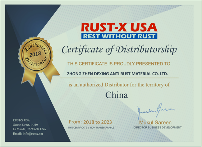 2017年10月25日中圳德興(北京)防銹材料有限公司成為美國(guó)RUST-X中國(guó)授權(quán)總代理,給中國(guó)客戶(hù)提供銹蝕防控解決方案。