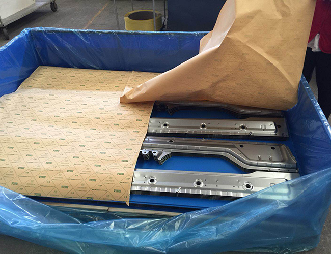 根據(jù)客戶周裝箱尺寸定制氣相防銹袋VC-702(2400*1700*1200mm),將中圳RUST-X的VCI-604防銹紙放置在車門板周圍,一層防銹紙一個(gè)車門板,然后用干燥劑放置在門板周圍(但不能直接接觸金屬),之后把氣相防銹袋封口,做到一個(gè)相對(duì)密閉的環(huán)境,使氣相防銹達(dá)到優(yōu)異的效果。