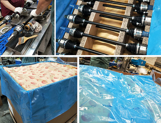 2.更換包裝方式:將目前包裝于產(chǎn)品兩端的小規(guī)格的防銹袋撤掉,對于產(chǎn)品兩端不再采用特別包裝。這種包裝的好處是節(jié)約成本,同時可以將防銹油置換出來的水份,隨著儲存及集裝箱中的高溫變成水蒸汽,被包裝箱內(nèi)的干燥劑吸收掉。如果單獨產(chǎn)品進(jìn)行防銹袋的包裝,我司技術(shù)工程師認(rèn)為,有部份被蒸發(fā)的水蒸汽,會在經(jīng)過集裝箱溫差變化的情況出現(xiàn)后,在小型防銹袋表面出現(xiàn)冷凝現(xiàn)象,不利于干燥劑的吸收.