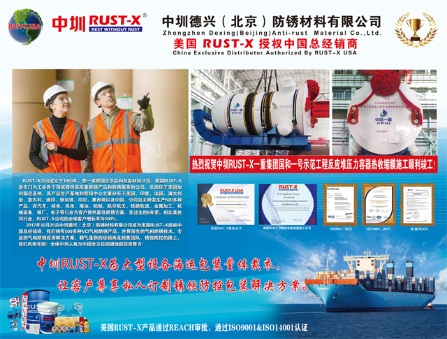 2017年10月25日中圳德興(北京)防銹材料有限公司成為美國RUST-X授權中國總經銷商。我們擁有500多種VCI氣相防銹產品,主營:氣相防銹油、水性防銹劑、氣相防銹膜、氣相防銹涂料、氣相防銹粉末、金屬除銹劑、水基清洗劑,水性防銹添加劑、氣相防銹盒、氣相防銹海綿等。