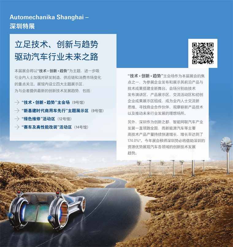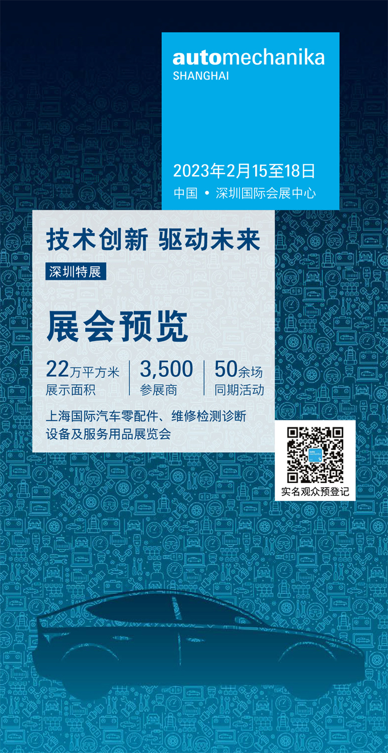 上海國際汽車零配件、維修檢測診斷設(shè)備及服務(wù)用品展覽會(Automechanika Shanghai) — 深圳特展將于2023年2月15至18日在中國創(chuàng)新之都深圳國際會展中心(寶安新館)盛大舉行