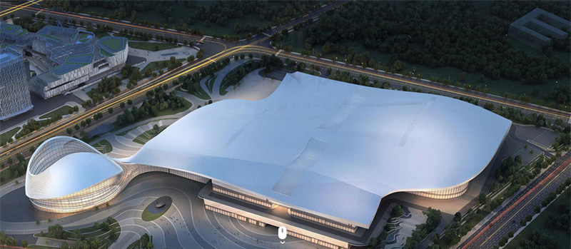 煙臺(tái)八角灣國(guó)際會(huì)展中心位于煙臺(tái)開(kāi)發(fā)區(qū)八角街道,占地13.9萬(wàn)平方米,展館以“城岸云浪·海上云貝”為設(shè)計(jì)理念,將煙臺(tái)的碧海與藍(lán)天相接,海浪與白云相交融,再融入輕盈的銀貝終演化出建筑結(jié)構(gòu)與造型相互統(tǒng)一、結(jié)構(gòu)清晰的,集展覽區(qū)、會(huì)議區(qū)和配套商業(yè)區(qū)為一 體的會(huì)展商業(yè)體。