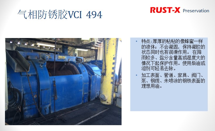 VCI氣相防銹膠可以用于保護建筑物、化工廠和設備,這些計劃戶外存儲或放置在露天區(qū)域需要保護的物體;也可用來保護裸露的精煉廠設備、油管道設備和閥門;近海精煉廠未噴漆或未涂層的零部件;儲存期間、調(diào)試期間、關機備用的設備;還可用于熱交換器、風力機和汽車工業(yè)。由于VCI氣相防銹膠滴點高,它可以用于運行時溫度升高的化工廠和設備。