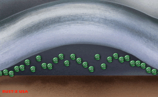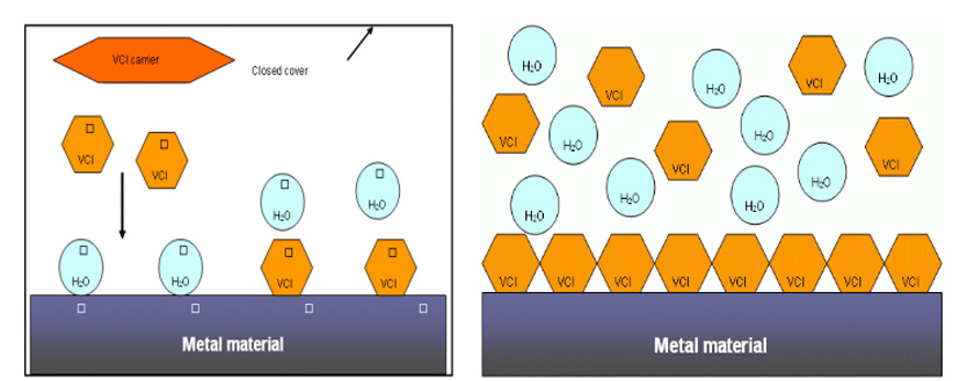 氣相防銹技術(shù)也稱VCI技術(shù),(VCI是英文氣相緩蝕劑 volatile corrosion inhibitor的縮寫(xiě))。氣相防銹技術(shù)的原理:氣相緩蝕劑VCI在常溫能夠持續(xù)緩慢的氣化、揮發(fā)出來(lái)的緩蝕氣體吸附在裸露的金屬表面,形成一個(gè)穩(wěn)定保護(hù)膜,該保護(hù)膜能防止氧氣、濕氣等因素對(duì)金屬的腐蝕。